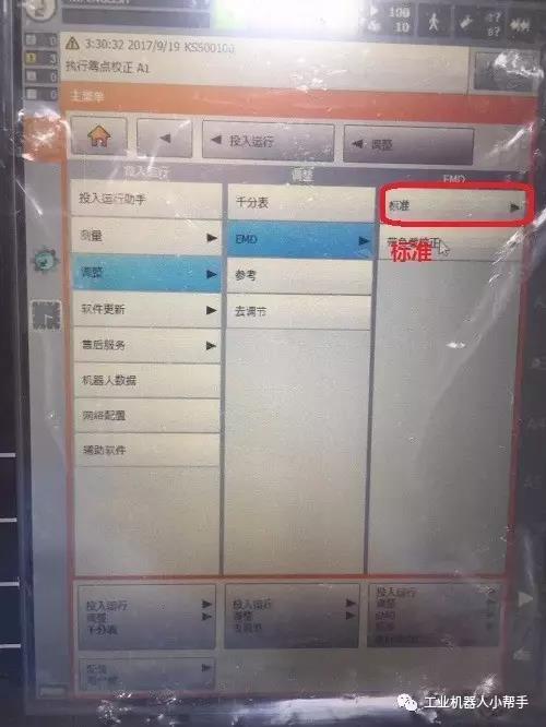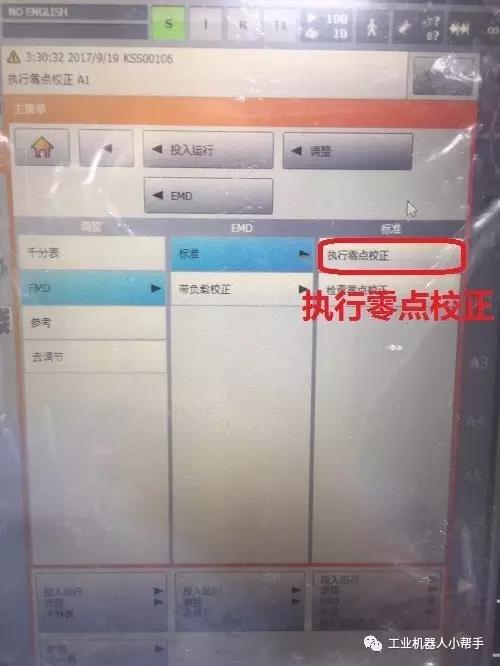 step 4:點擊示教器主菜單鍵,選擇投入運行-調整-EMD-標準-執行零點標定;