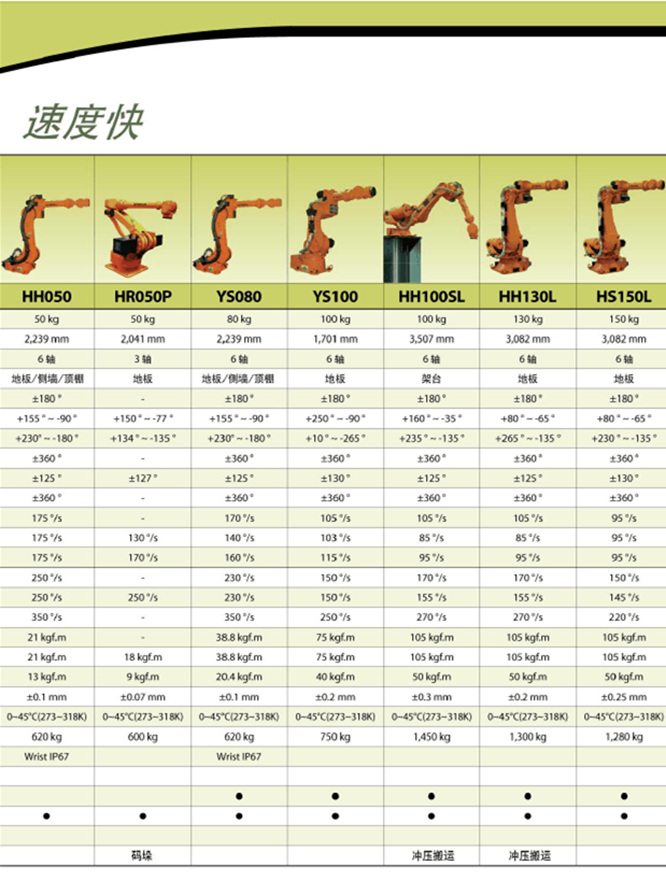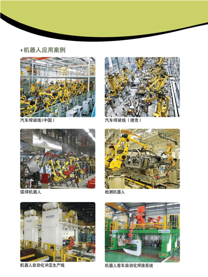 直角坐標型工業機器人 、 圓柱坐標型工業機器人、 圓柱坐標型工業機器人 、多關節型工業機器人、平面關節型工業機器人?;『笝C器人、 激光焊機器人、電阻焊機器人、自動化焊接機器人、點焊機器人、等離子切割機器人、清潔機器人、上料機器人、物料輸送機器人、材料去除機器人、包裝機器人、噴漆機器人、自動鉆孔機器人、堆跺機器人、涂層機器人、去毛刺機器人、磨銷機器人、高溫噴涂機器人等。
